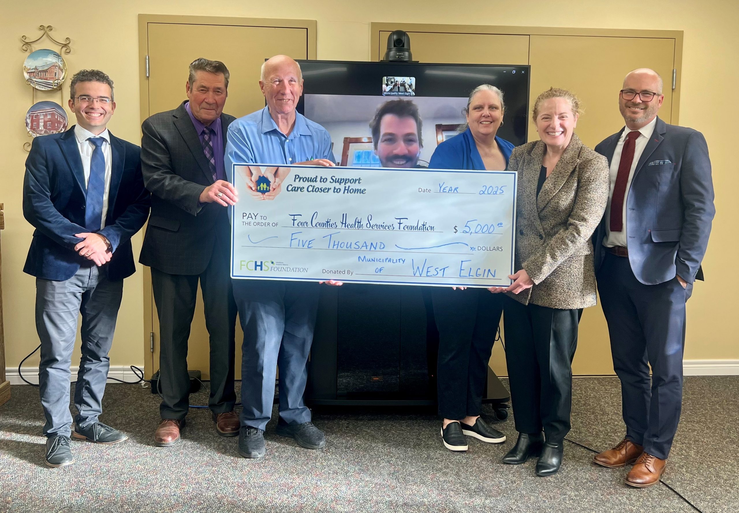 Pictured at the meeting are West Elgin Councillor Philip Sousa, Mayor Richard Leatham, FCHS Foundation Chair Tom Jeffery, Councillor Ryan Statham (via video), Deputy Mayor Taraesa Tellier, MHA President & CEO Julie McBrien, and Councillor Bill Denning.